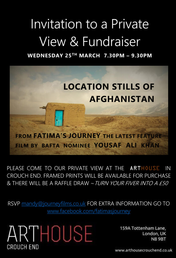 Come to the private view and fundraiser for Fatima’s Journey and see the Location Stills of Afghanistan by Yousaf Ali Khan (director) on Wednesday 25th March from 7.30pm-9.30pm.