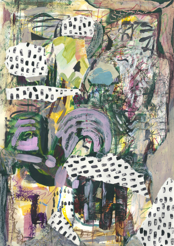 “Spontaneity occurs I am open and relaxed,” Meera claims, with the air of a zen master. “When I am about to leave the studio and just removing excess paint from my pallette, I can sometimes make the most interesting marks because I feel the most free in my gestures when there are no expectations on outcome” Giving your work the space to talk to you, respond to your brushstrokes, is the true spirit of spontaneity. Quickly layering fast-drying acrylic paint, intuitively ripping and sticking old paintings and utilising found objects such as earphone wires as in The Secret World of Headphones: Part 1 [2019].