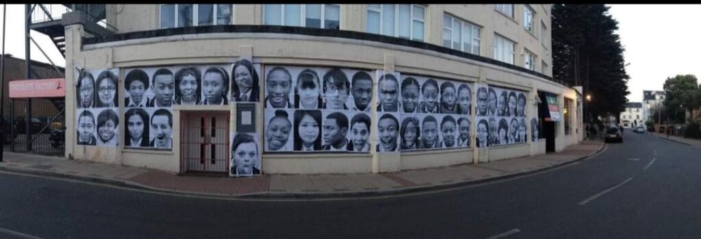 Chocolate Factory 2 on Coburg Road has been transformed by students from a South London school and Chocolate Factory artist Karen Lois Whiteread. The project ‘All Angels in Flux’ is part of the worldwide ‘Inside Out‘ project, brainchild of international artist JR and supported by Collage Arts. Inside Out is a large-scale participatory art project that transforms messages of personal identity into pieces of artistic work.