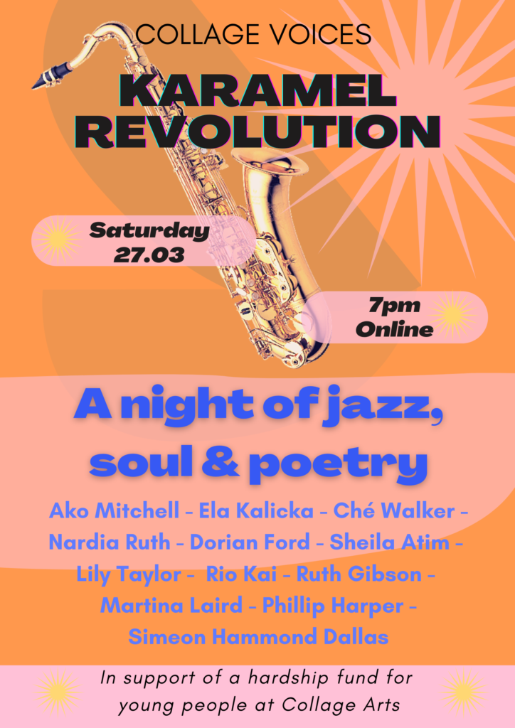 Join us online on Saturday 27th March 2021 at 7pm when our favourite company of artists, musicians and actors return to Collage Arts and Karamel for an evening of jazz, poetry, soul and fundraising.