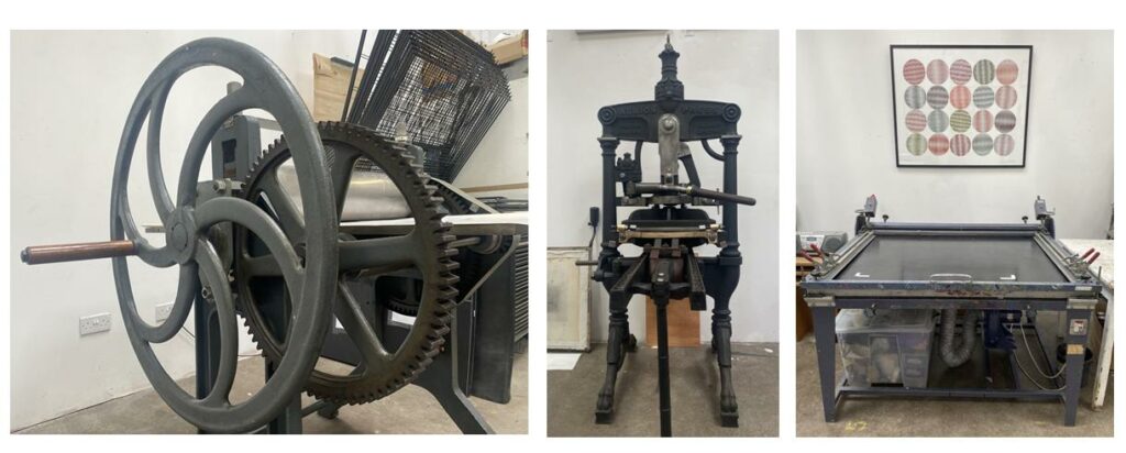 The first thing a Print Workshop needs is presses. Thanks to Nancy and Ben and Giles from AMR Logan Press, we have now installed a splendid Hunter Penrose etching press & a beautiful Albion Press, dating from 1863. The Marler screen printing press is ready for action too.