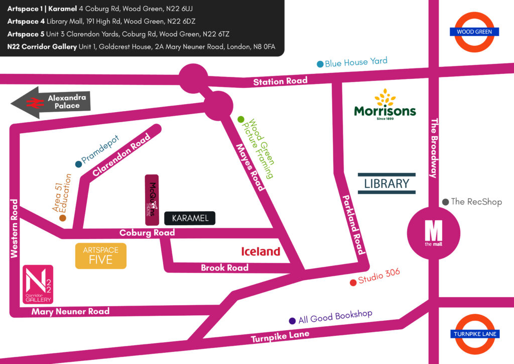 THROUGHOUT NOVEMBER 2024, we invite you to discover the alternative arts scene in Wood Green, Haringey London N22 starting at Blue House Yard, The Rec Shop and Studio 306; over to Coburg Road’s Karamel N22, McQueens Theatre, Collage Artspace 5, Area 51’s John Dewey Technical College, PramDepot, to the Penstock Tunnel and the new N22 Corridor Gallery in the St William development formerly Clarendon, now known as Alexandra Gate.