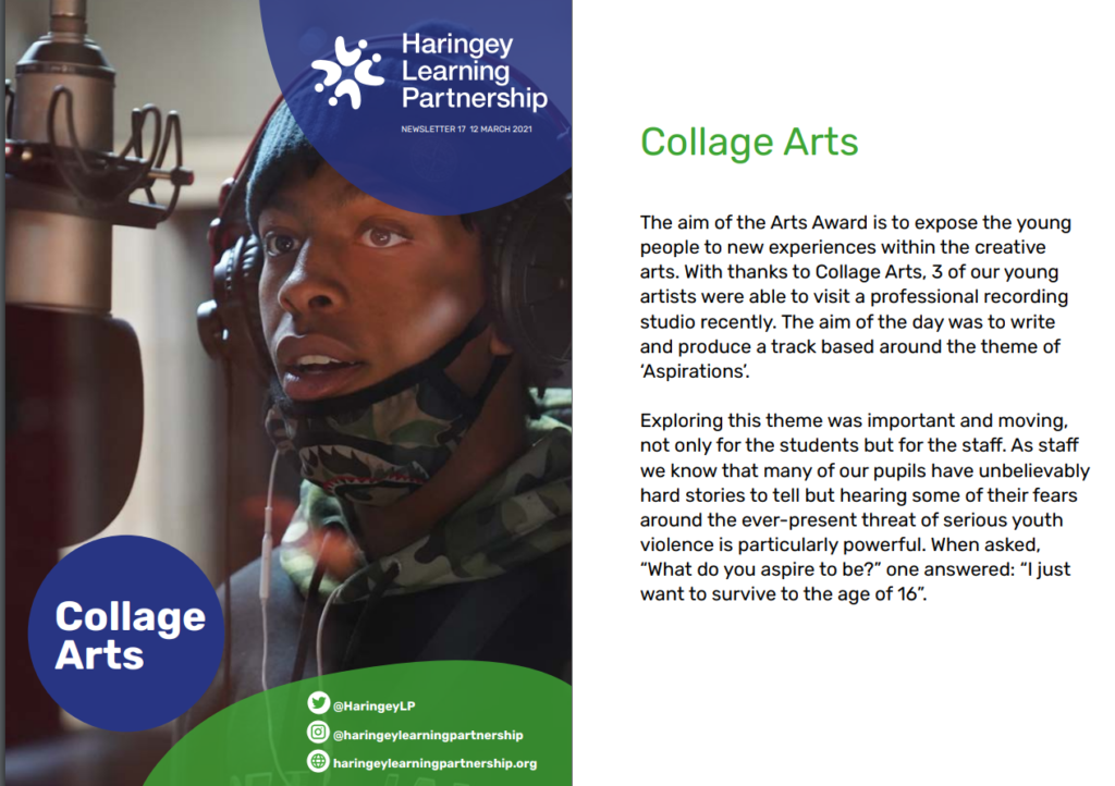 We are thrilled to have been featured in the Haringey Learning Partnership newsletter this month. 3 young artists visited our recording studios and created a powerful music track, themed on ‘Aspirations’.