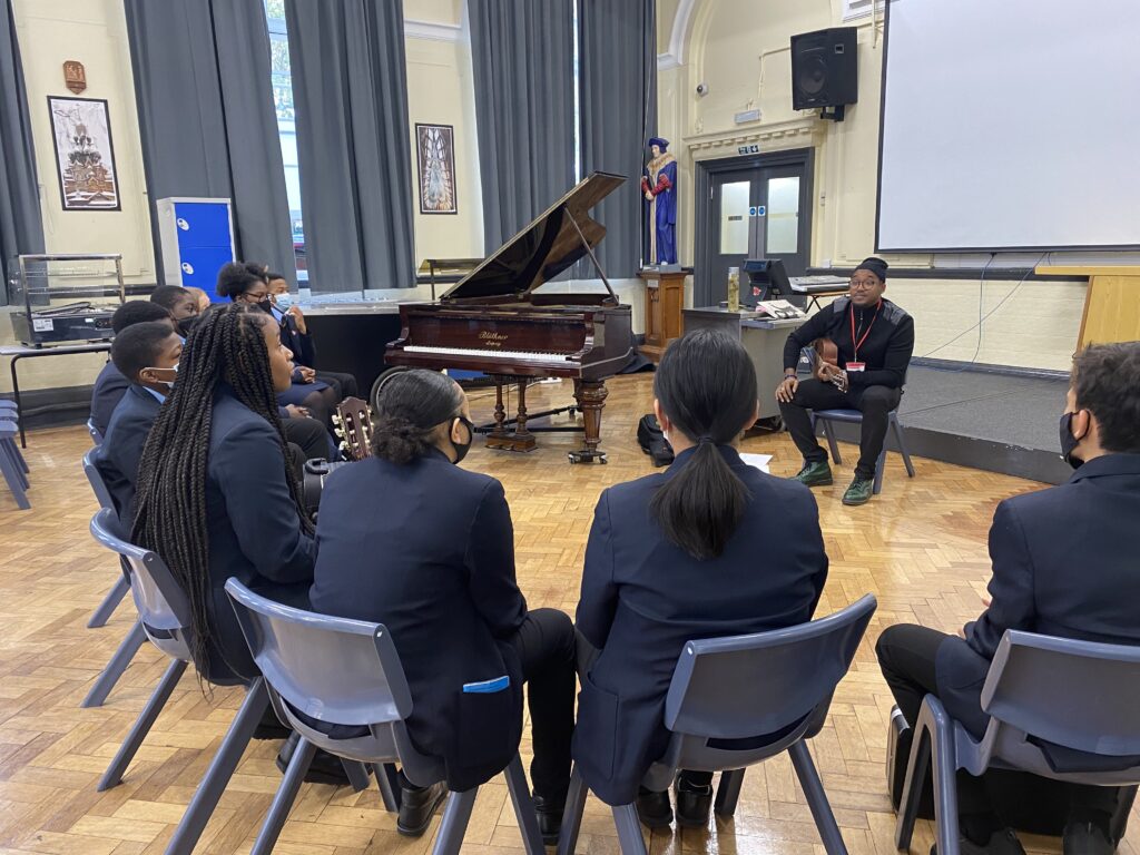 Images: Kevin Mark Trail delivering songwriting sessions at St Thomas More School and students working at Tony Mahama’s studio.